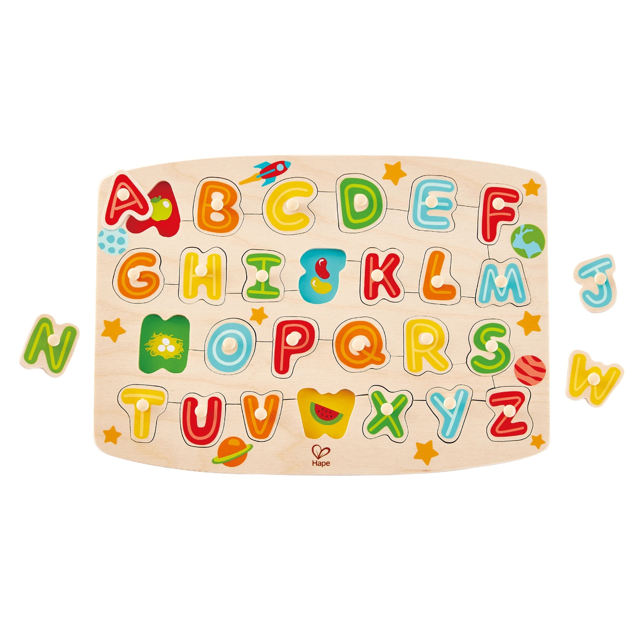 • The alphabet puzzle includes a puzzle base and 26 colorful, lettered puzzle pieces with pegs.