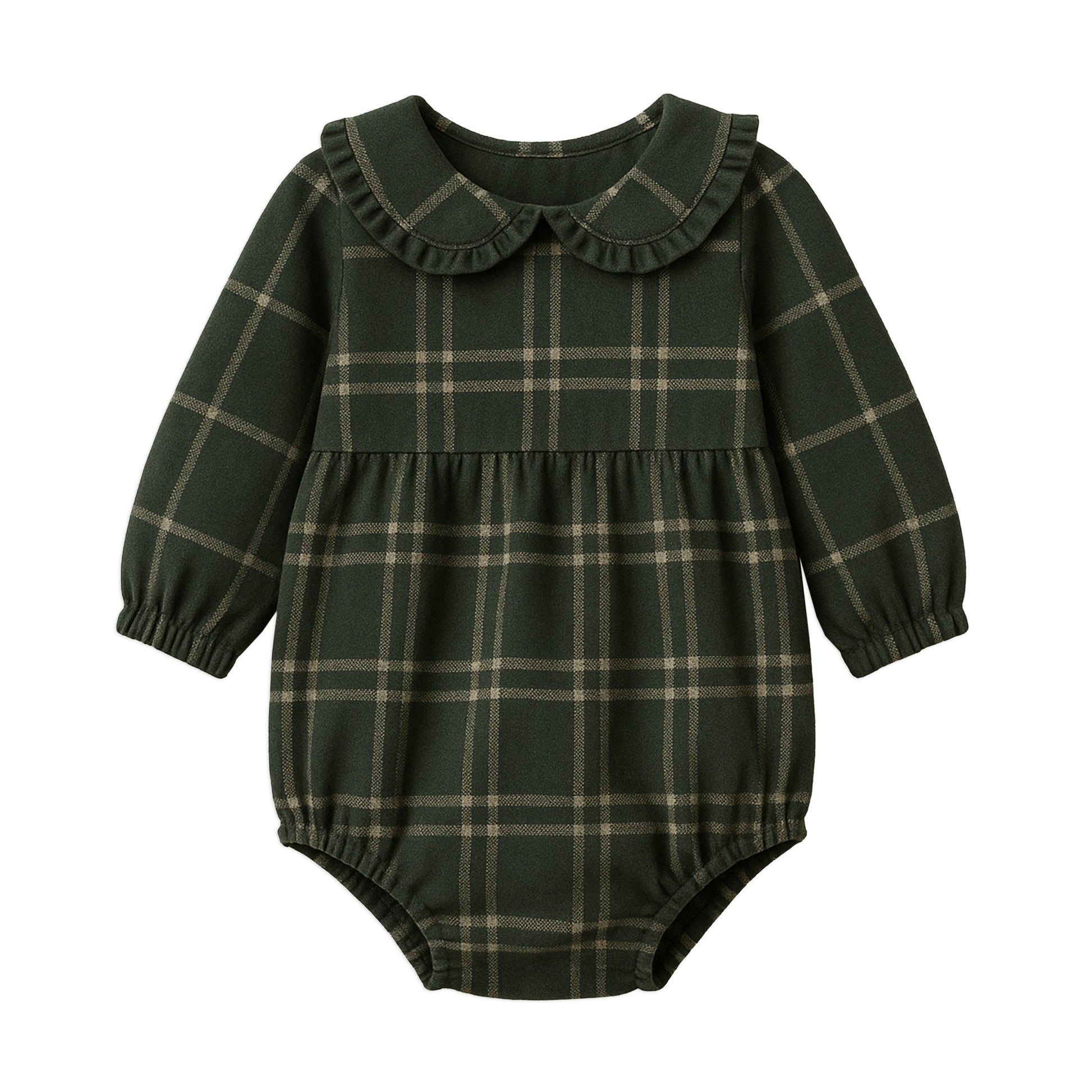 * Made of 100% Organic Cotton Flannel * Peter Pan collar with ruffle and purl edge finish * Wood button back closure * Gathered waist seam and puffed sleeve detail * Elastic sleeve and leg openings * Nickel-free snap leg opening for easy changes * Water-based dyes ensuring long-lasting color vibrancy and durability * Sustainably sourced and ethically produced * Naturally hypoallergenic * Machine Wash Cold, Tumble Dry Low