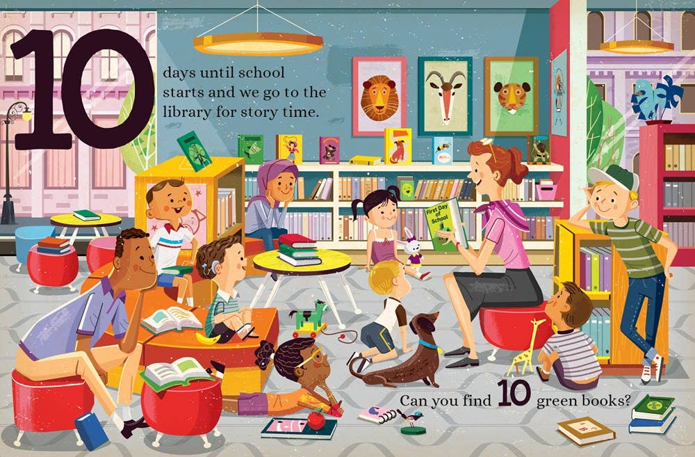 Toddlers learn to count down from 10 to 1 as they mark the days until school begins, and they can practice counting by finding objects hidden throughout these fun back-to-school scenes in Paprocki’s classically retro mid-century art style.