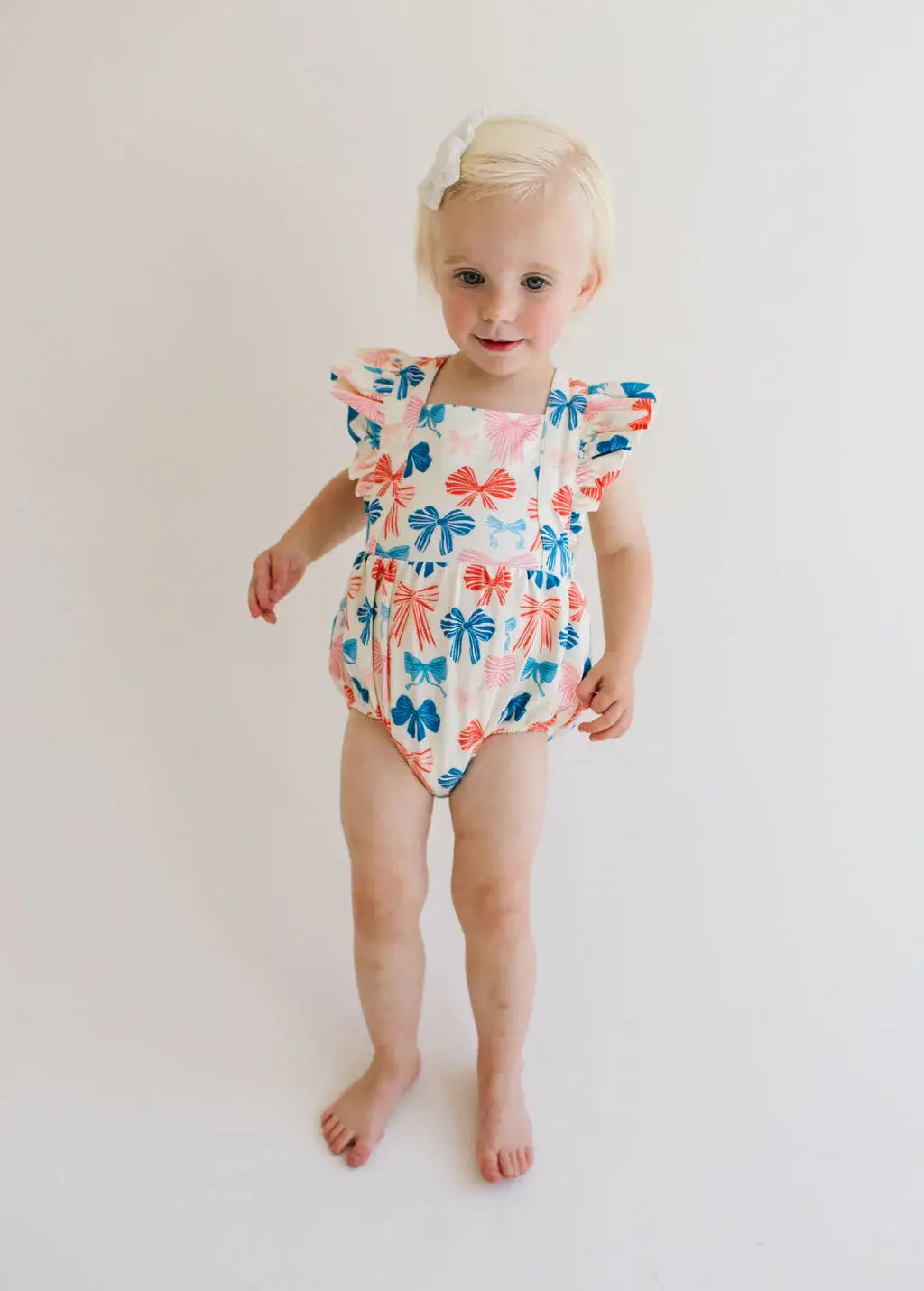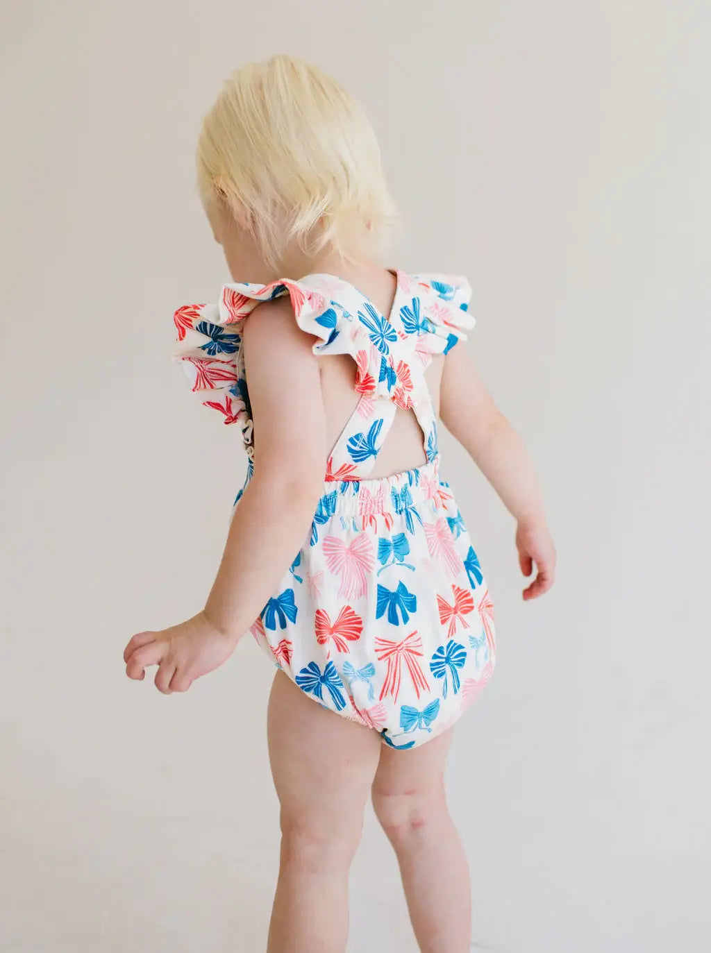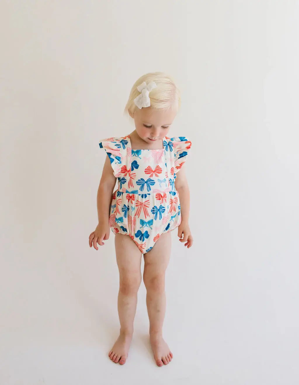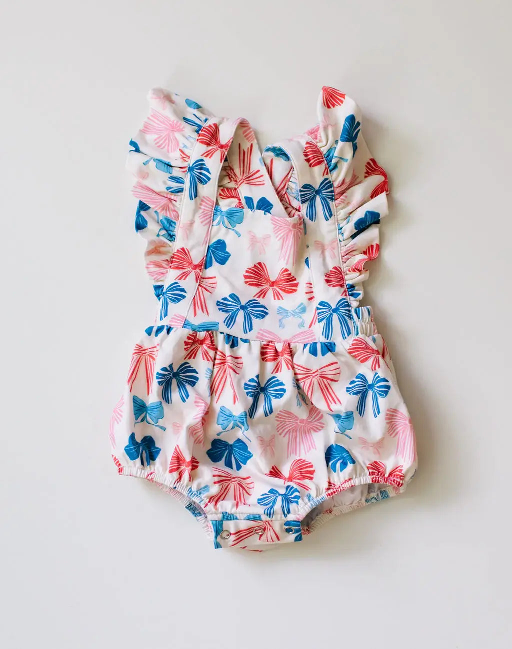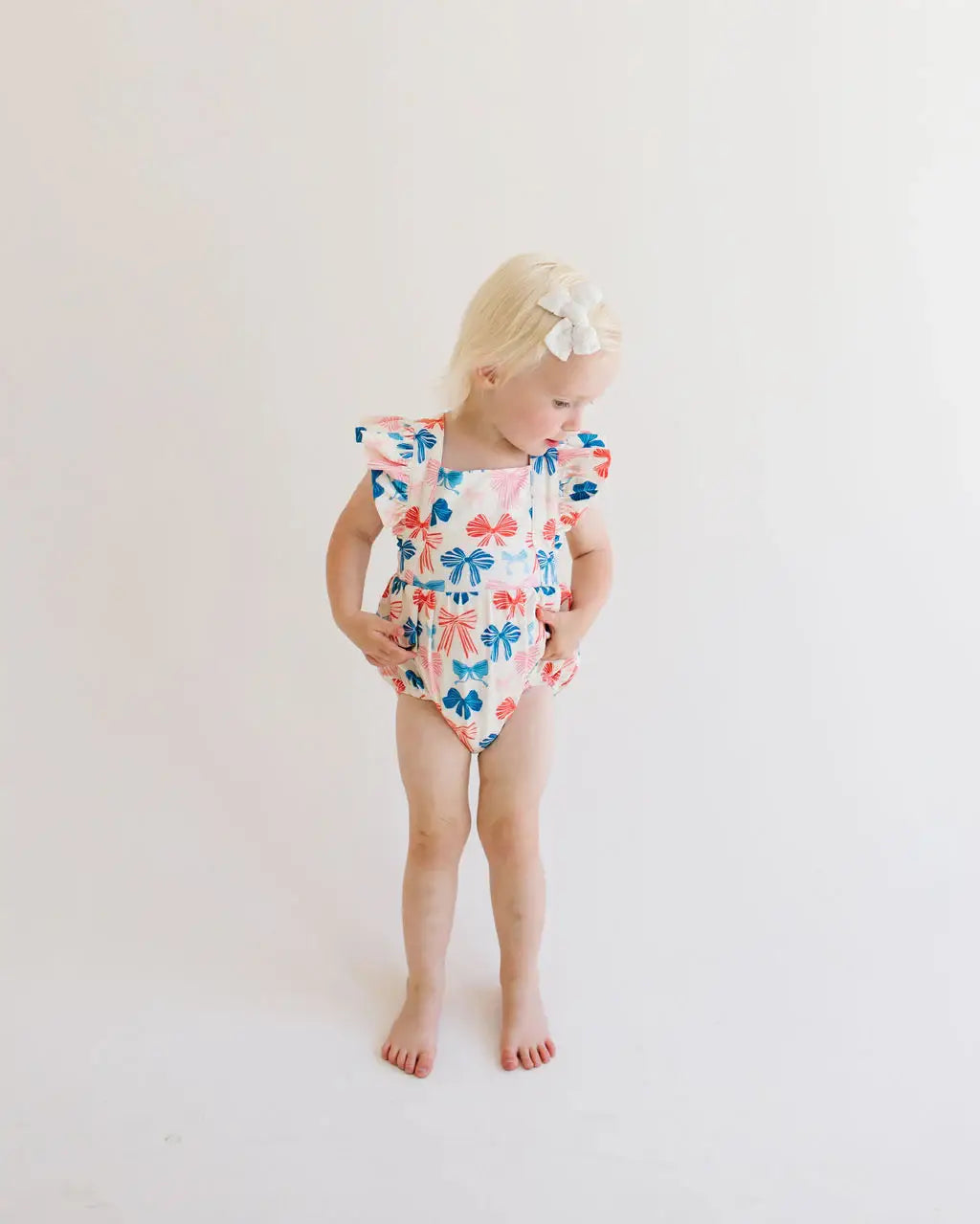 Featuring ruffled details along the shoulders and down the back, as well as adjustable straps for growing babes.