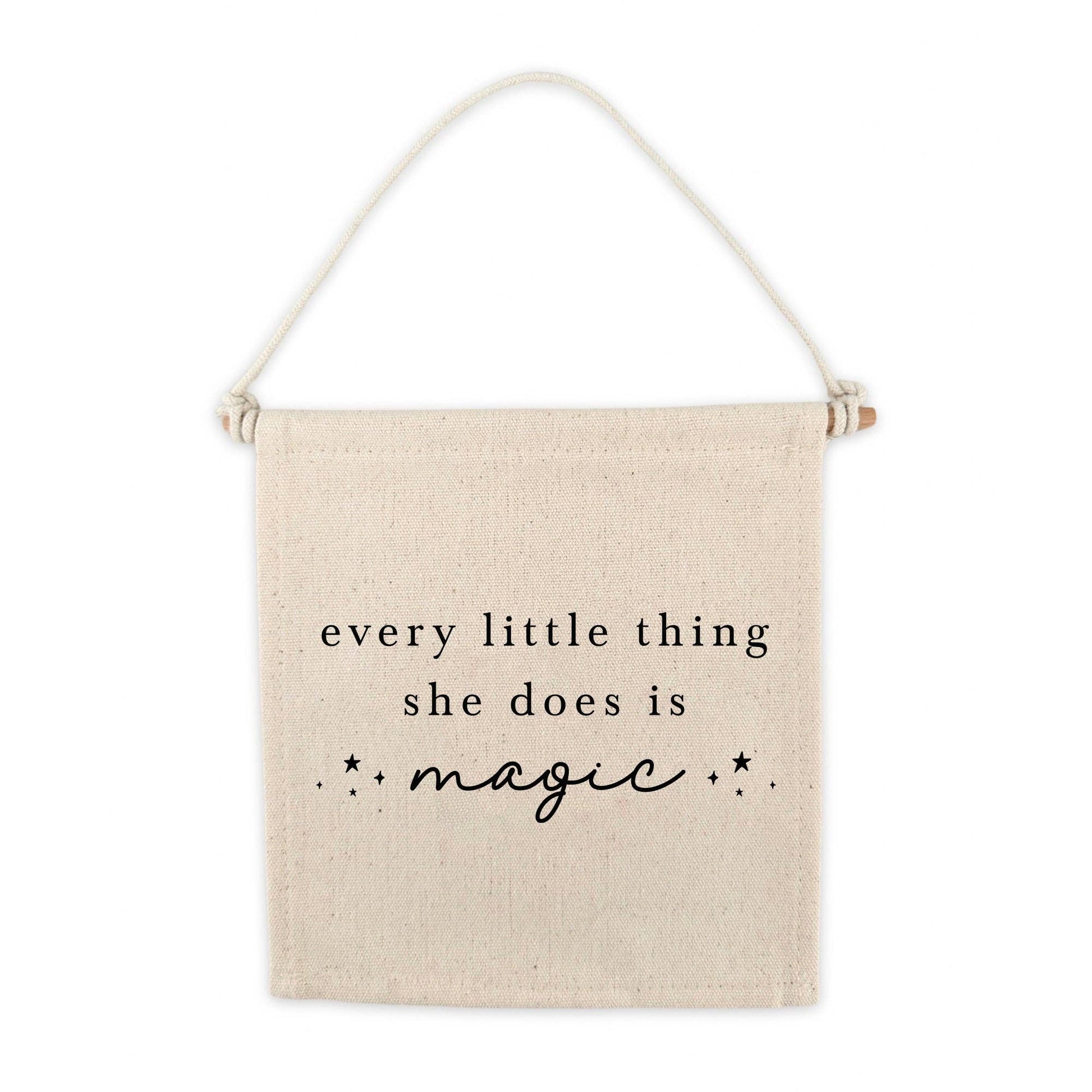 Every Little Thing She Does Is Magic Canvas Hang Sign Cherrypick canvas hang signs are an easy and affordable way to decorate with minimal effort! Whether hanging on a wall, doorknob, bookshelf, or play space, our canvas hang signs add a fun and magical touch, making every space a happy place. Customers love our canvas hang signs because they are: * Made of premium 100% cotton canvas in a beautiful, off-white natural canvas colour * Hand sewn and screen printed by hand with non-toxic ink * Strung on a durable cotton twine and hung using a wood dowel * Perfect for playroom, nursery, and kids wall decor! Dimensions: Canvas 7.5x8