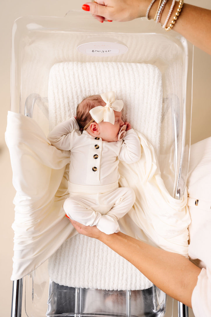 Good things come in pairs and our tops + bottoms are no exception. They’re made from our signature silky-soft material for a stretchy, comfy fit with functional buttons and fold-over waistband for room to grow (or to wear high-waisted). Say goodbye to socks that slip right off with built-in footies (on the newborn size only) to keep those tiny toes warm without the fuss. Unbelievably sweet mixing & matching approved.