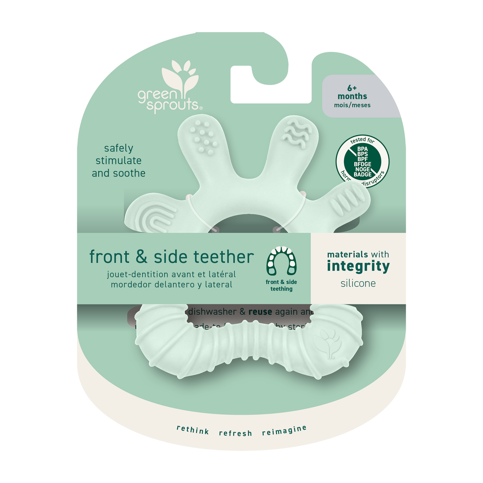 Help soothe your little one’s teething gum pain with our green sprouts® Silicone Front and Side Teether. The soft, flexible silicone teether is made with 100% food-safe, platinum-cured, silicone made without PVC, azo-dyes, formaldehyde, and hormone disrupters like BPA for baby’s health and safety. As part of our developmental teether series, this teething toy with multiple textures and bumps is designed for teething stage 2, which reaches to soothe baby’s front and side gums. The curved handle of the teething ring is easy for baby to pick up from a flat surface, hold, and chew and is perfectly sized for babies 6 months and older. Dishwasher and sterilizer safe for easy cleaning. Discover the other teethers in our developmental teether series, the green sprouts® Silicone Cleaning Teether (stage 1) and Silicone Molar Teether (stage 3), which reach different parts of your baby’s mouth with a variety of textures to help promote healthy oral development at all stages.