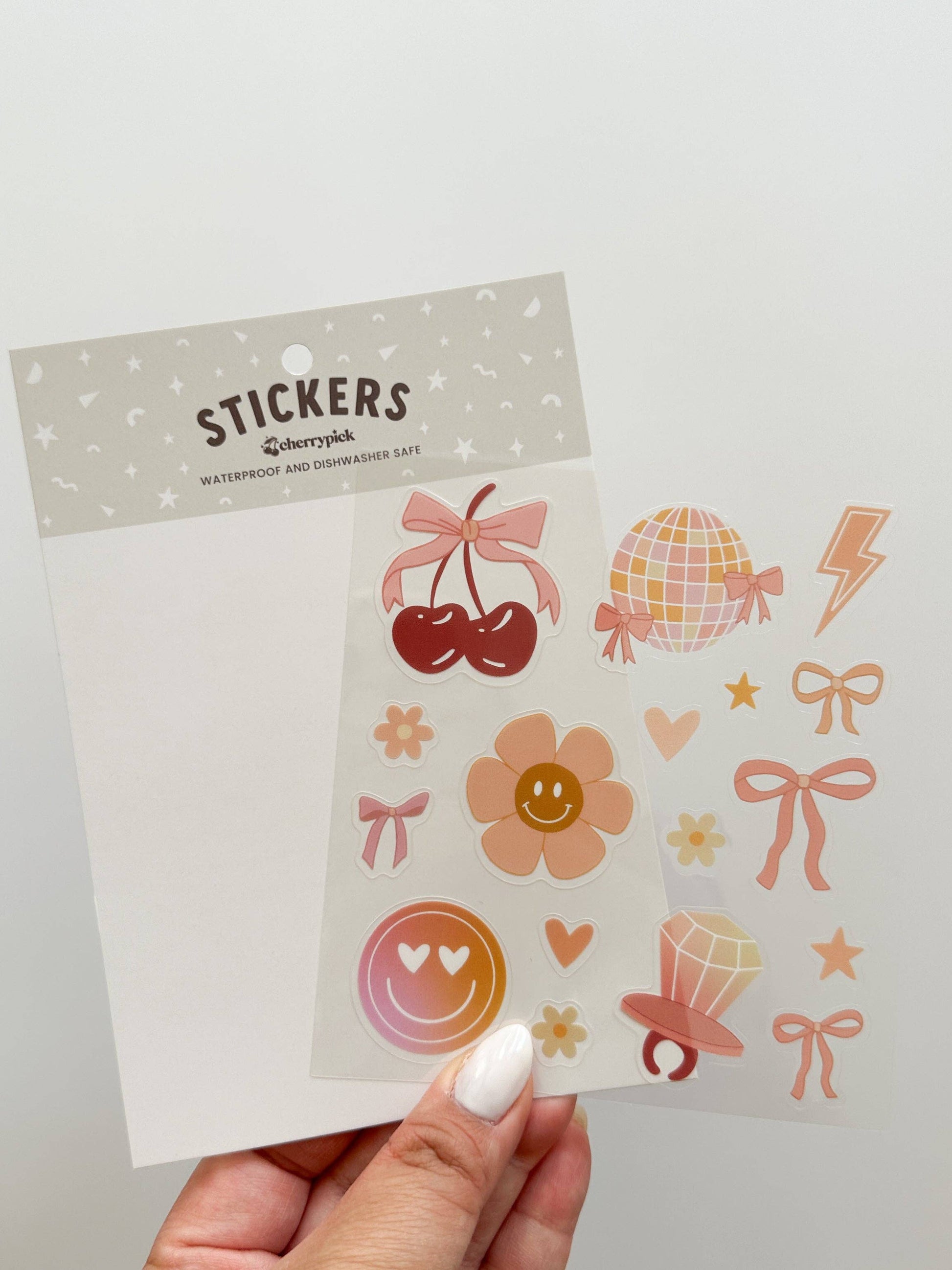 Made from premium vinyl, Cherrypick stickers are not just waterproof, but also durable and built to last through all the adventures your little ones embark on. Let creativity run wild as you stick them onto everything from lunchboxes, water bottles, notebooks, laptops, and beyond - there are no limits to where these playful stickers can go! Product details: * Size: 4.5x6.5" * Premium vinyl stickers printed with a transparent backing finish * Waterproof, tearproof, and dishwasher safe