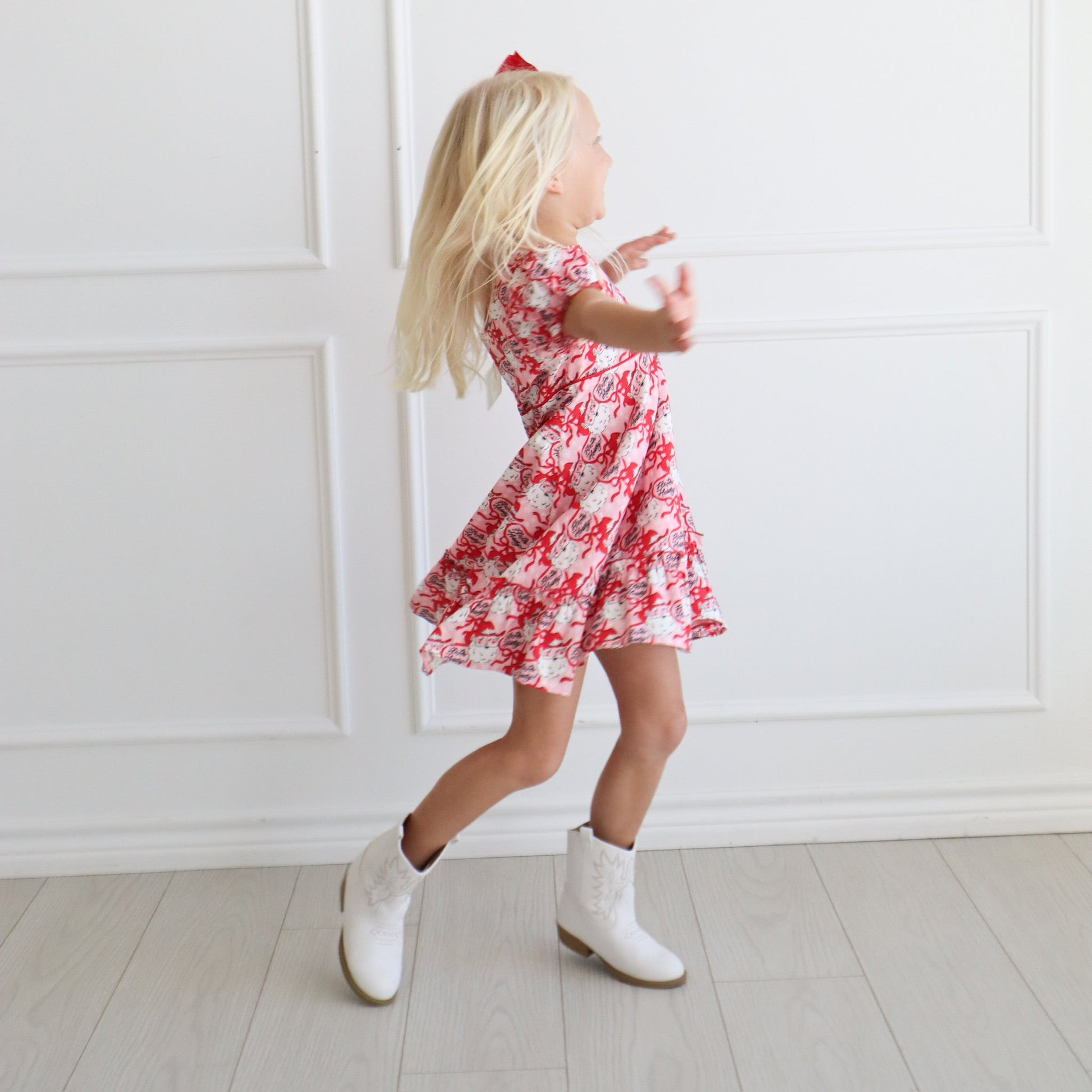 Get ready to twirl into the merriest hoedown of the season with our Ho Ho Howdy Santa Dress! Perfect for the sweetest little cowgirl in your life, this festive frock features jolly Santas spreading cheer straight from the North Pole to the Wild West. A holiday look that’s made for rootin’, tootin’, and twirlin’ by the tree!