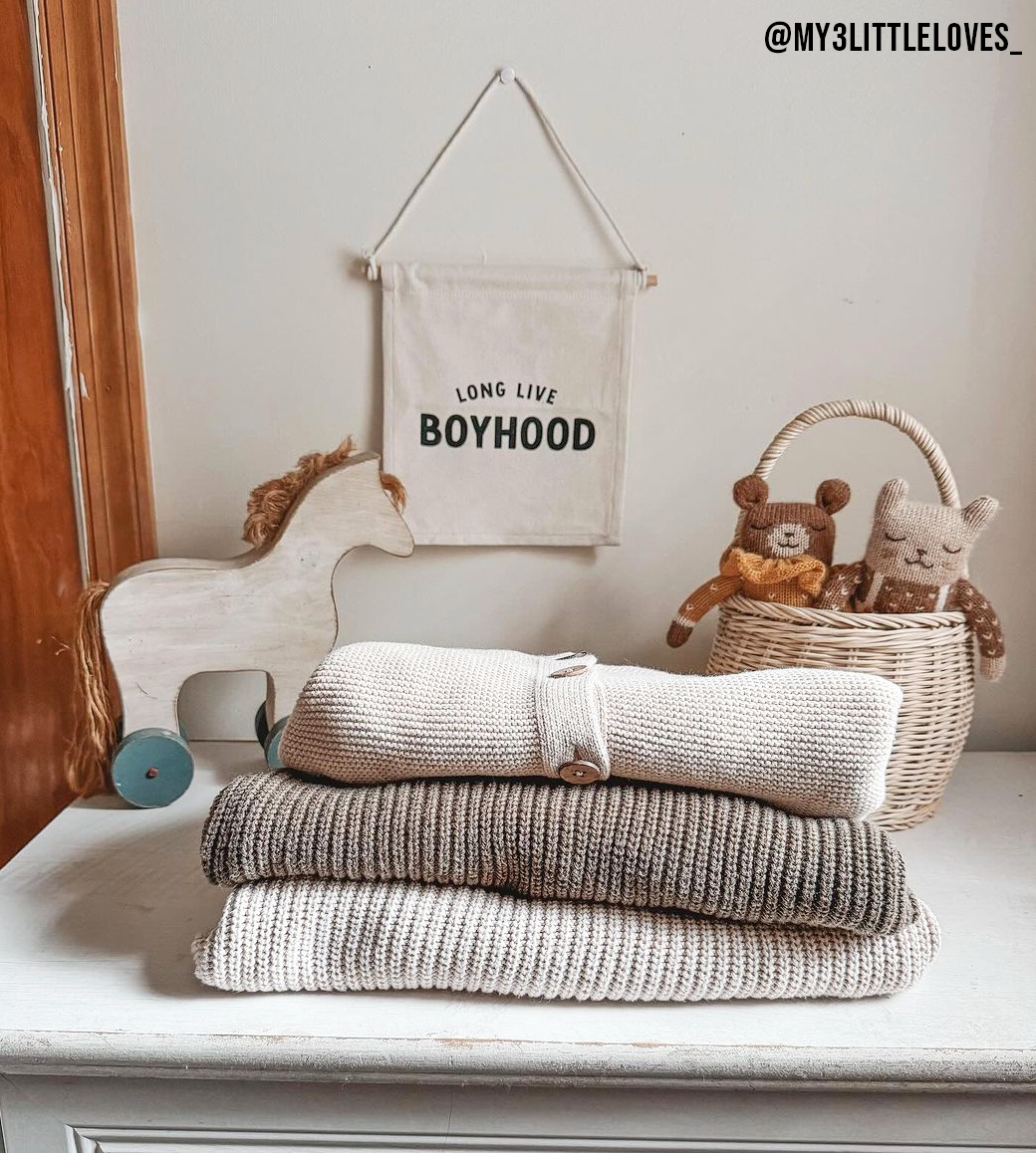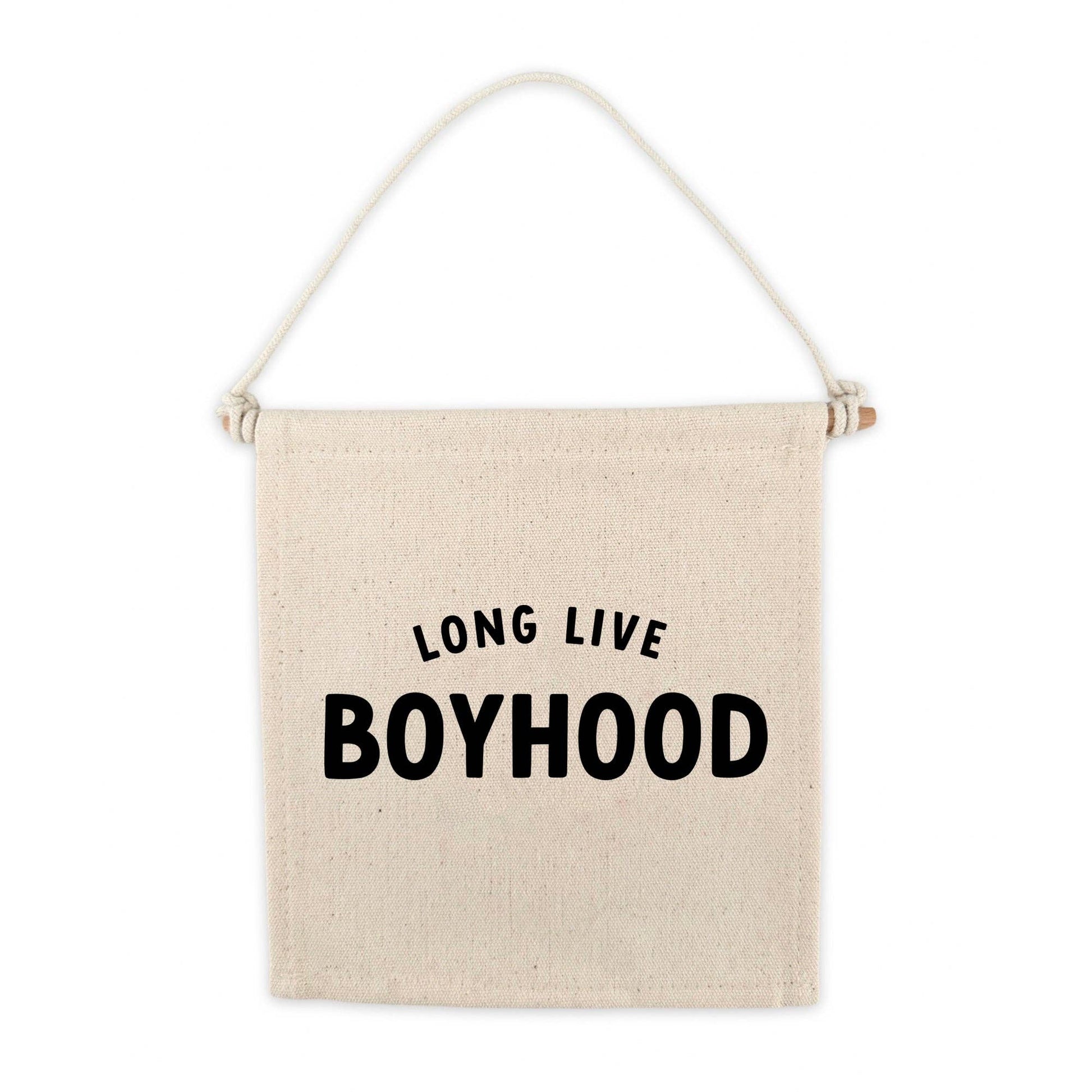 Long Live Boyhood (Natural) Canvas Hang Sign Cherrypick canvas hang signs are an easy and affordable way to decorate with minimal effort! Whether hanging on a wall, doorknob, bookshelf, or play space, our canvas hang signs add a fun and magical touch, making every space a happy place. Customers love our canvas hang signs because they are: * Made of premium 100% cotton canvas in a beautiful, off-white natural canvas colour * Hand sewn and screen printed by hand with non-toxic ink * Strung on a durable cotton twine and hung using a wood dowel * Perfect for playroom, nursery, and kids wall decor! Dimensions: Canvas 7.5x8