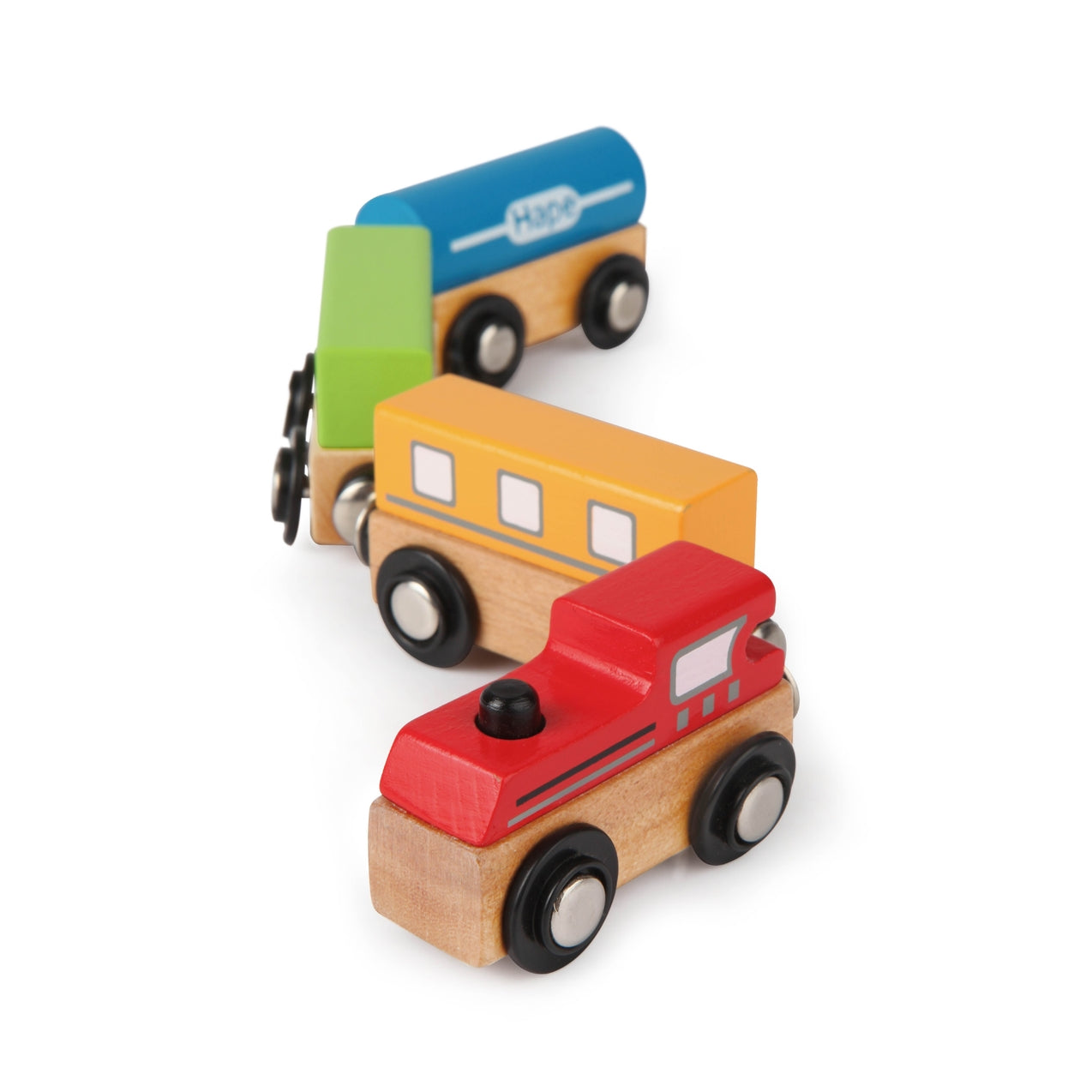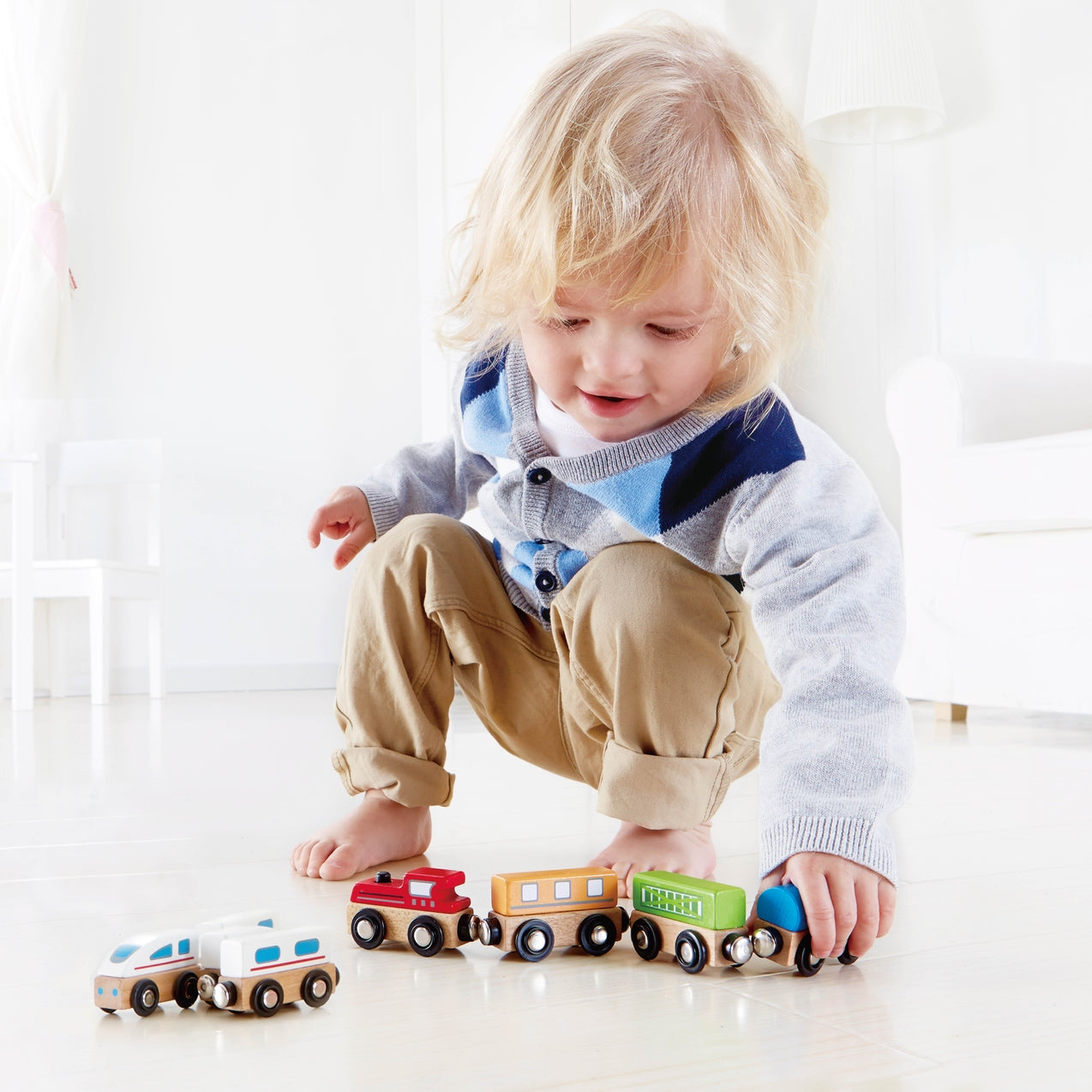 This colorful 4-car wooden train set encourages counting, color identification, story-telling and imaginative play.