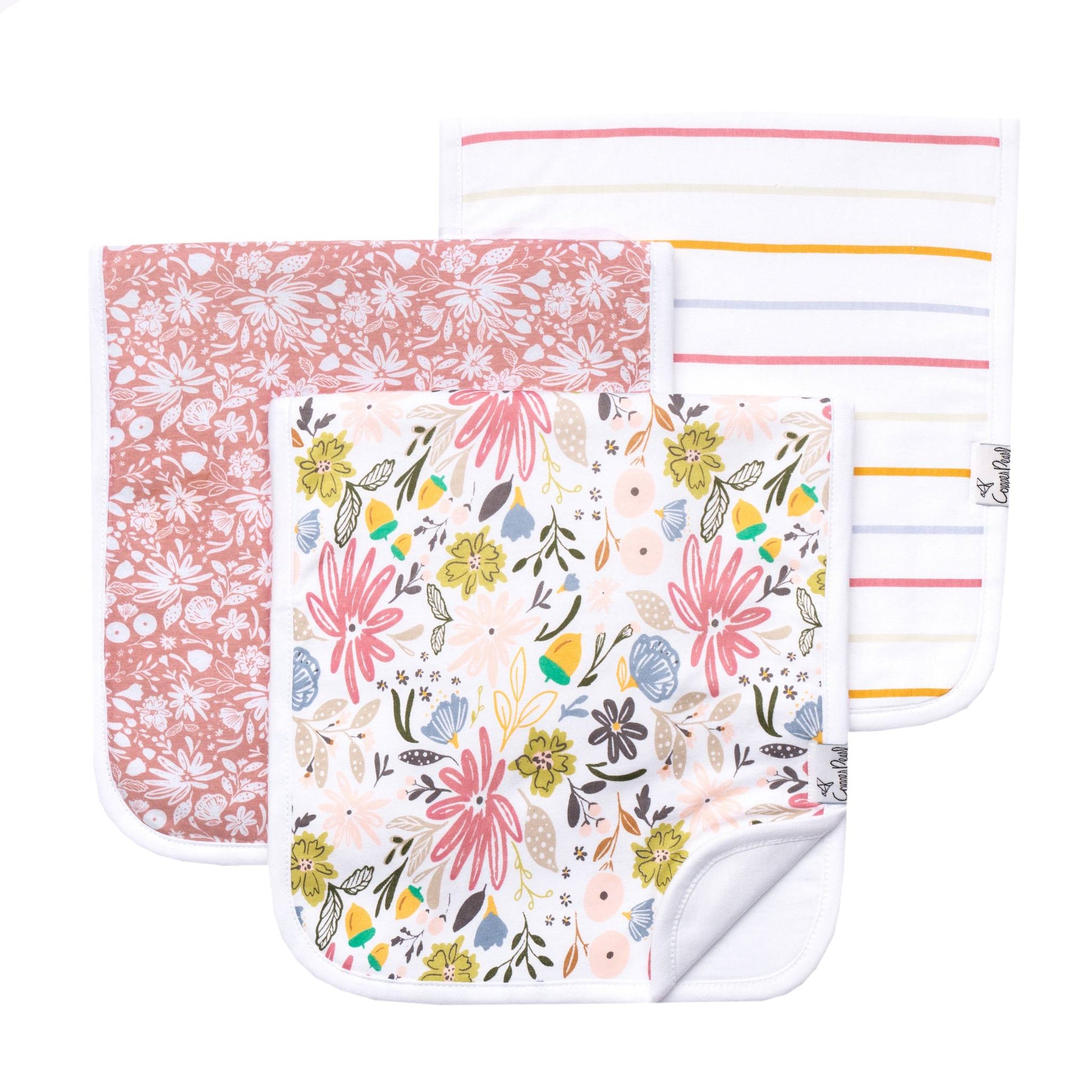 Our burp cloths are created with 100% ultra-soft cotton layers on the front (patterned) and back. You can feel confident that baby will feel cozy against your shoulder while burping.