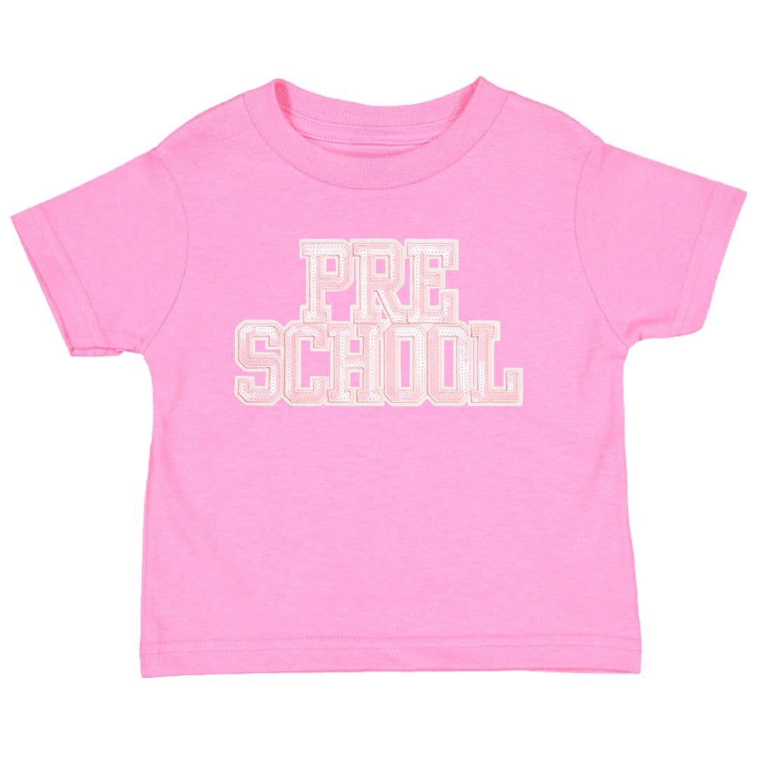 The Preschool Sequin Patch Short Sleeve T-Shirt is a fun and cute t-shirt for kids celebrating back to school! Features: *Shirt Color: Raspberry *Patch Color: Soft pink sequins with a white felt outline. *Material: 100% Cotton *Features: Tagless inside neck label for an itch-free wear *Fit: Toddler Unisex; True to Size *Care: Machine washable, wash inside out, lay flat to dry, wash with like colors