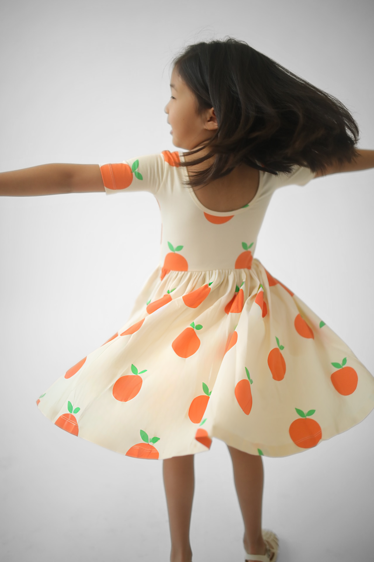 Good Apples dress is made with stretchy-soft organic cotton and features a scooped back, pockets for all their treasures, and a full circle skirt made for twirling.