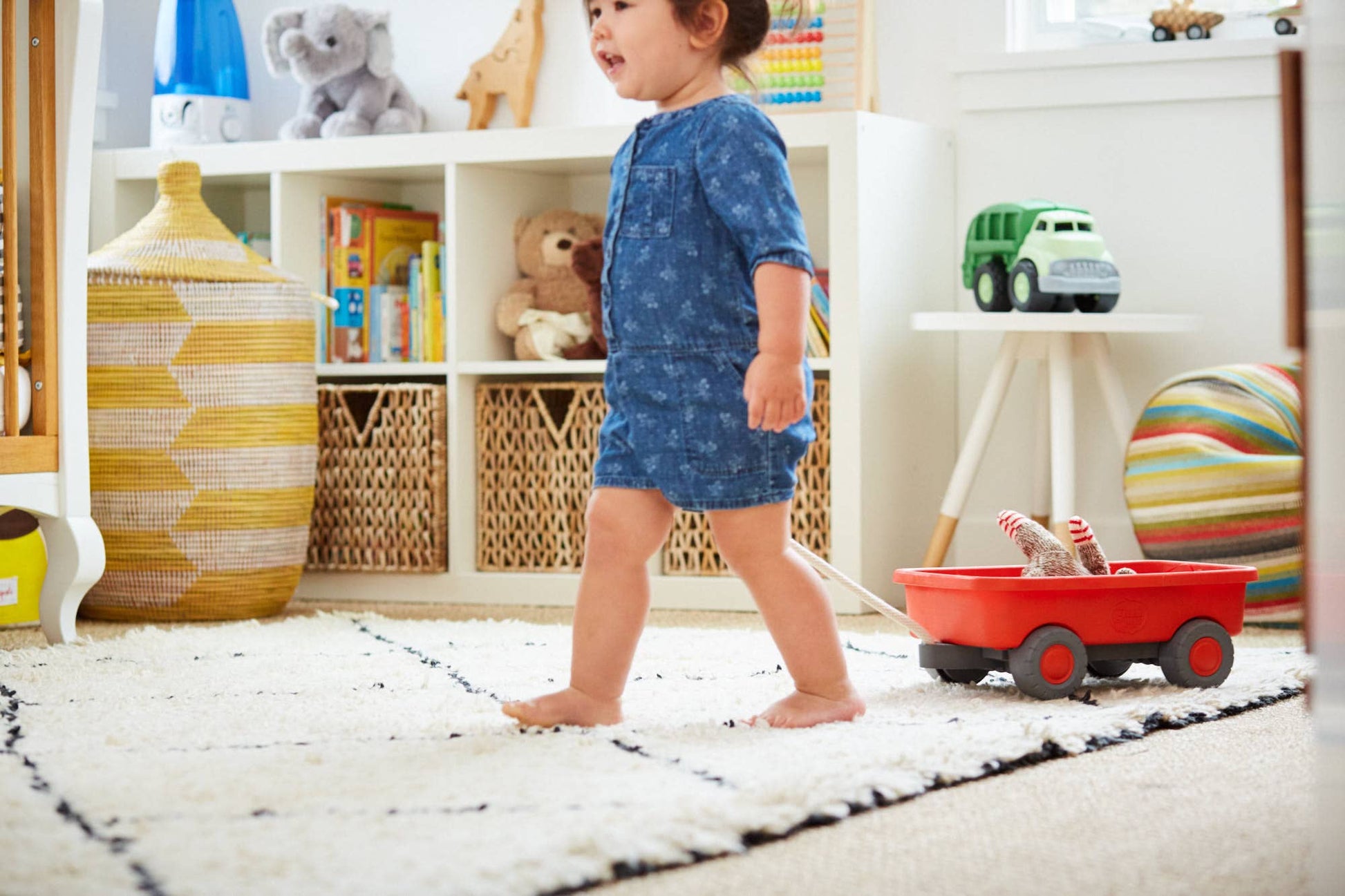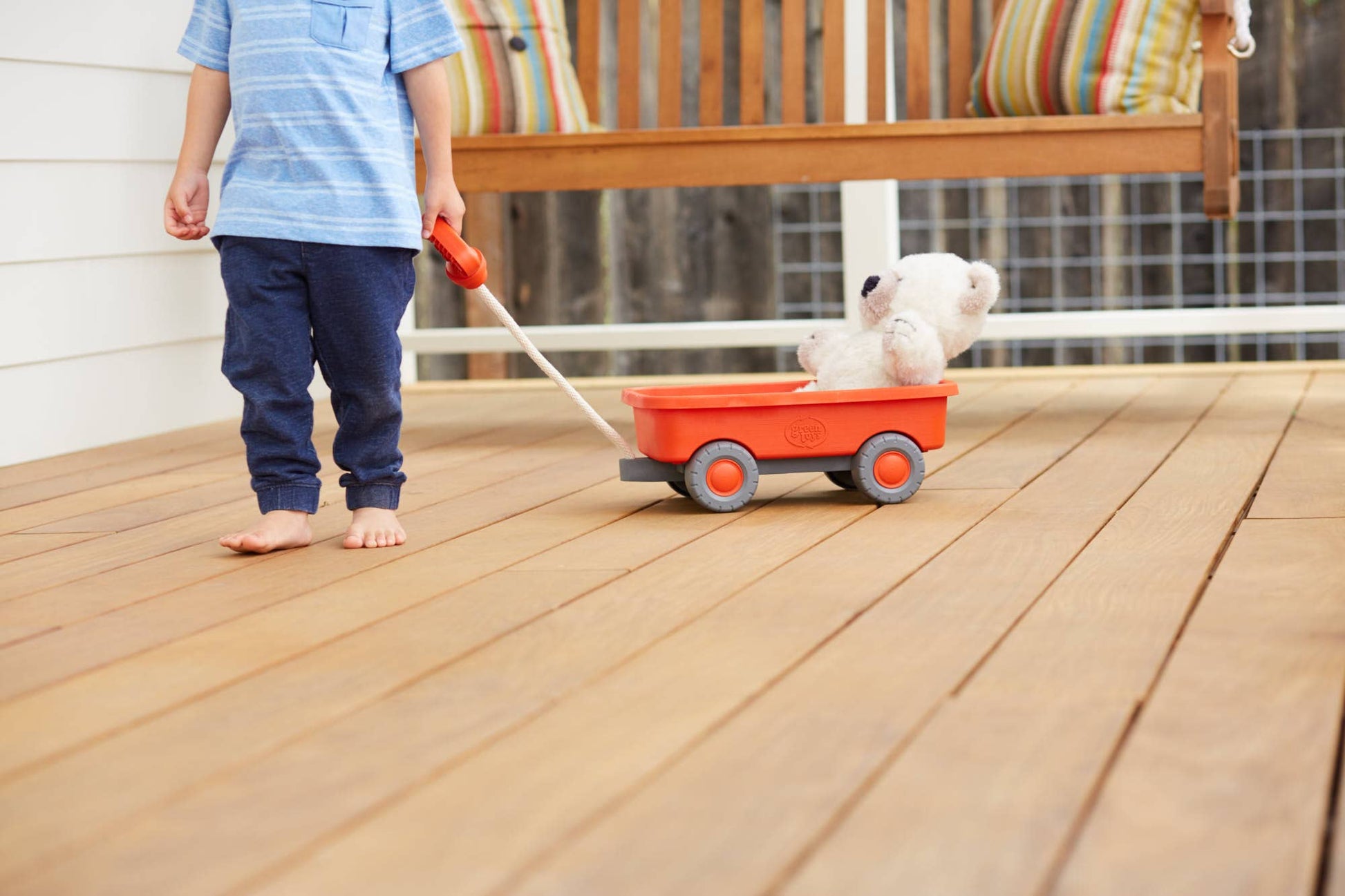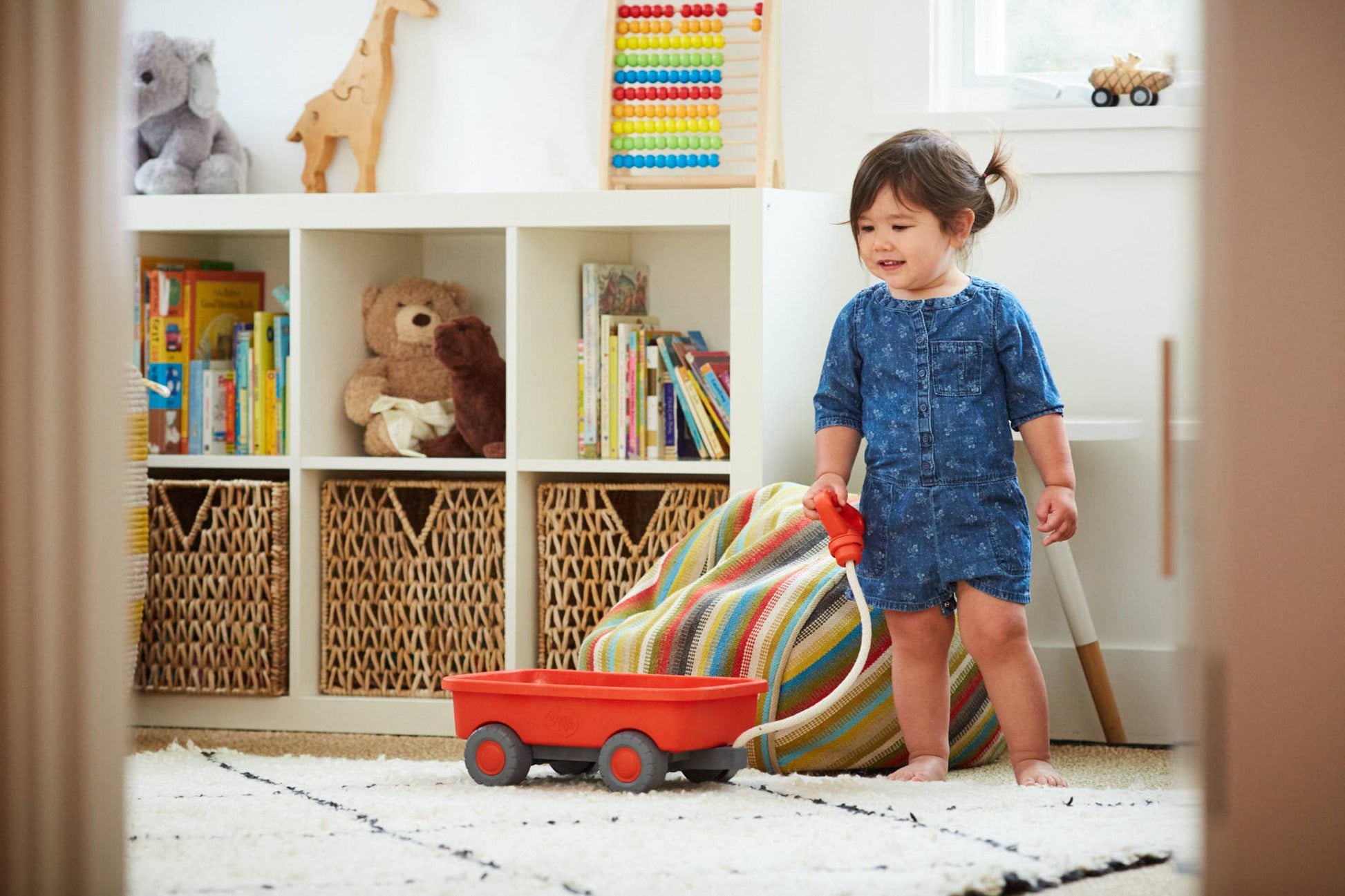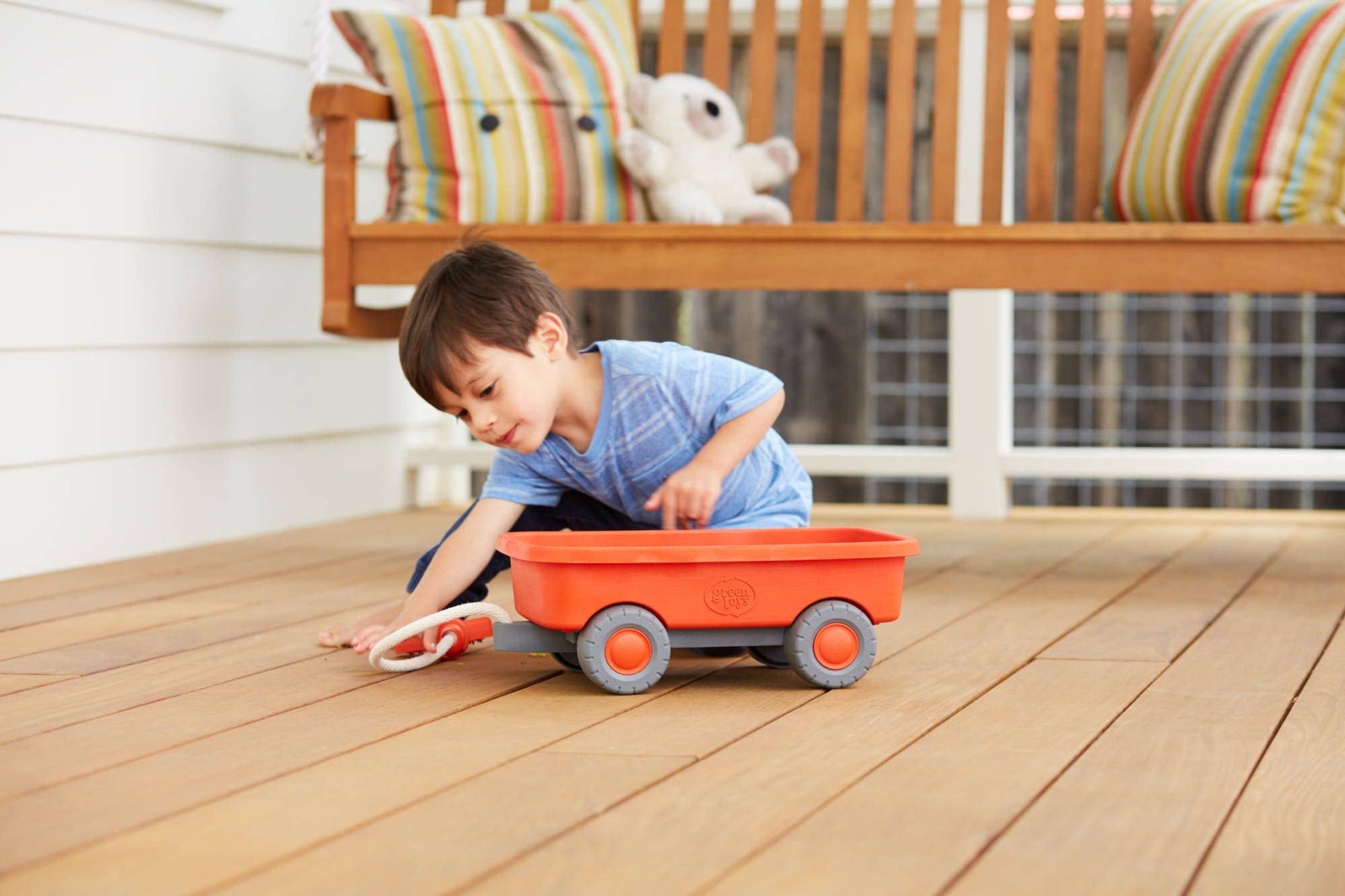 The Green Toys™ Wagon is sturdy and durable, and features a cotton rope handle that easily tucks inside for convenient, safe storage. With chunky tires and a low-set bed, it is the perfect size for little ones to haul around their most prized possessions, both indoors and outside.
