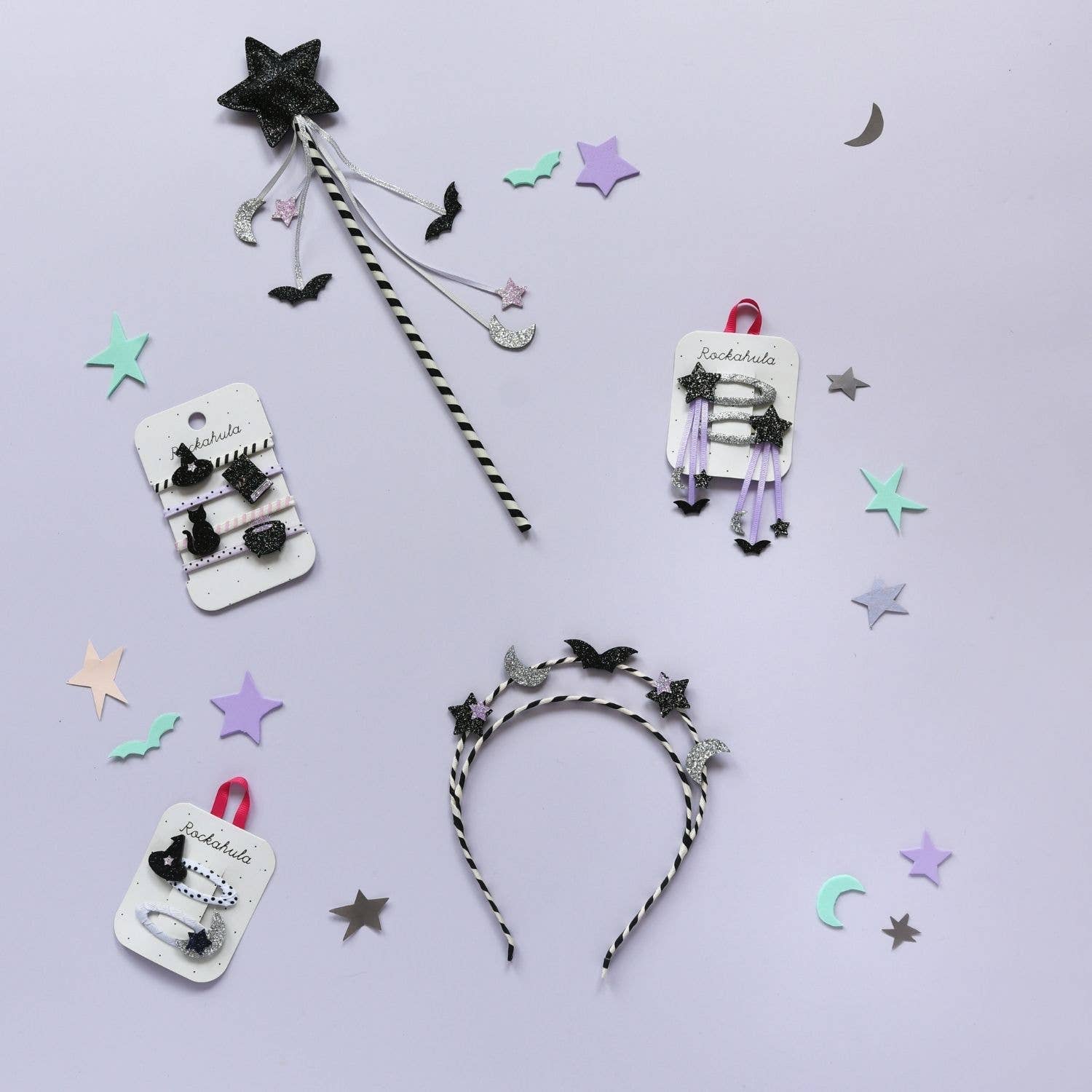 Are you superstitious? Join the witches, ghosts and ghouls wearing our witching hour clips. A glittering witches hat and a sparkling moon sit upon grosgrain ribbon snap clips, these are the perfect accessory for halloween season!