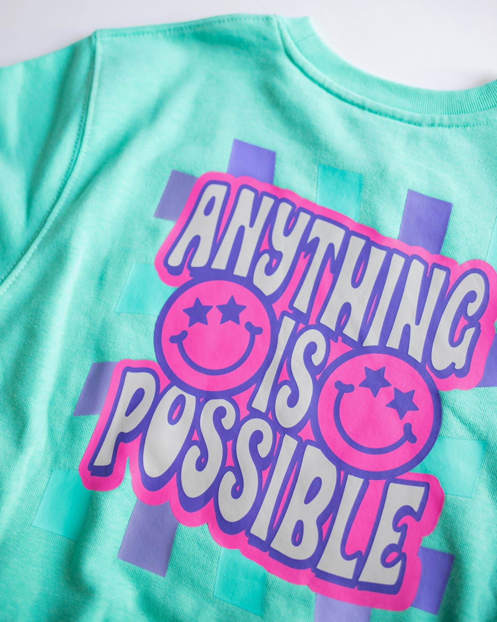 Smiley screen print on left chest,'anything is possible' design screen print on back.